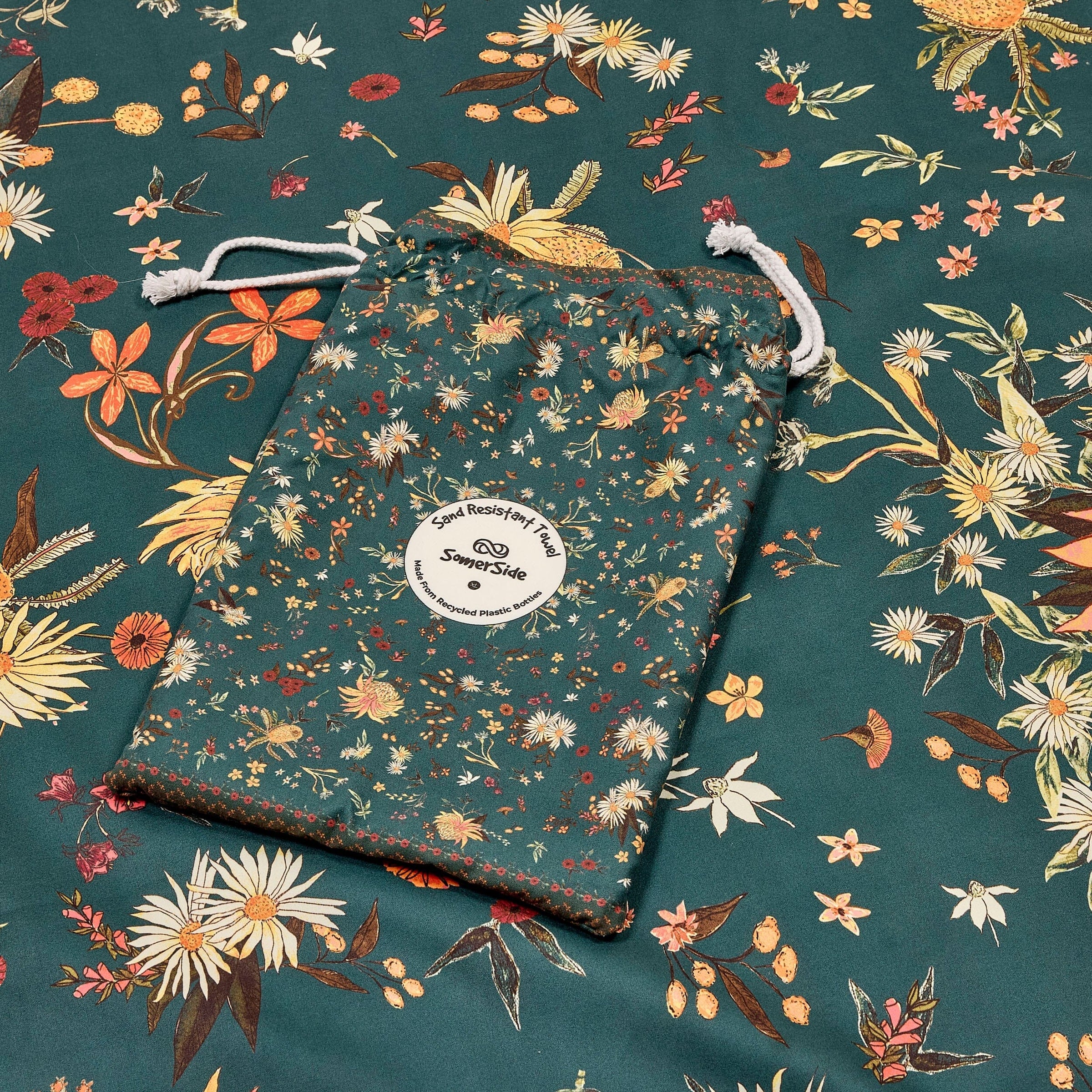 Beautiful hand-drawn native Australian florals on an emerald green background. The Native Botanical Premium Towel features Banksias, Waratahs, and a stunning arrangement of florals. This best selling design is now available in our quick dry range.