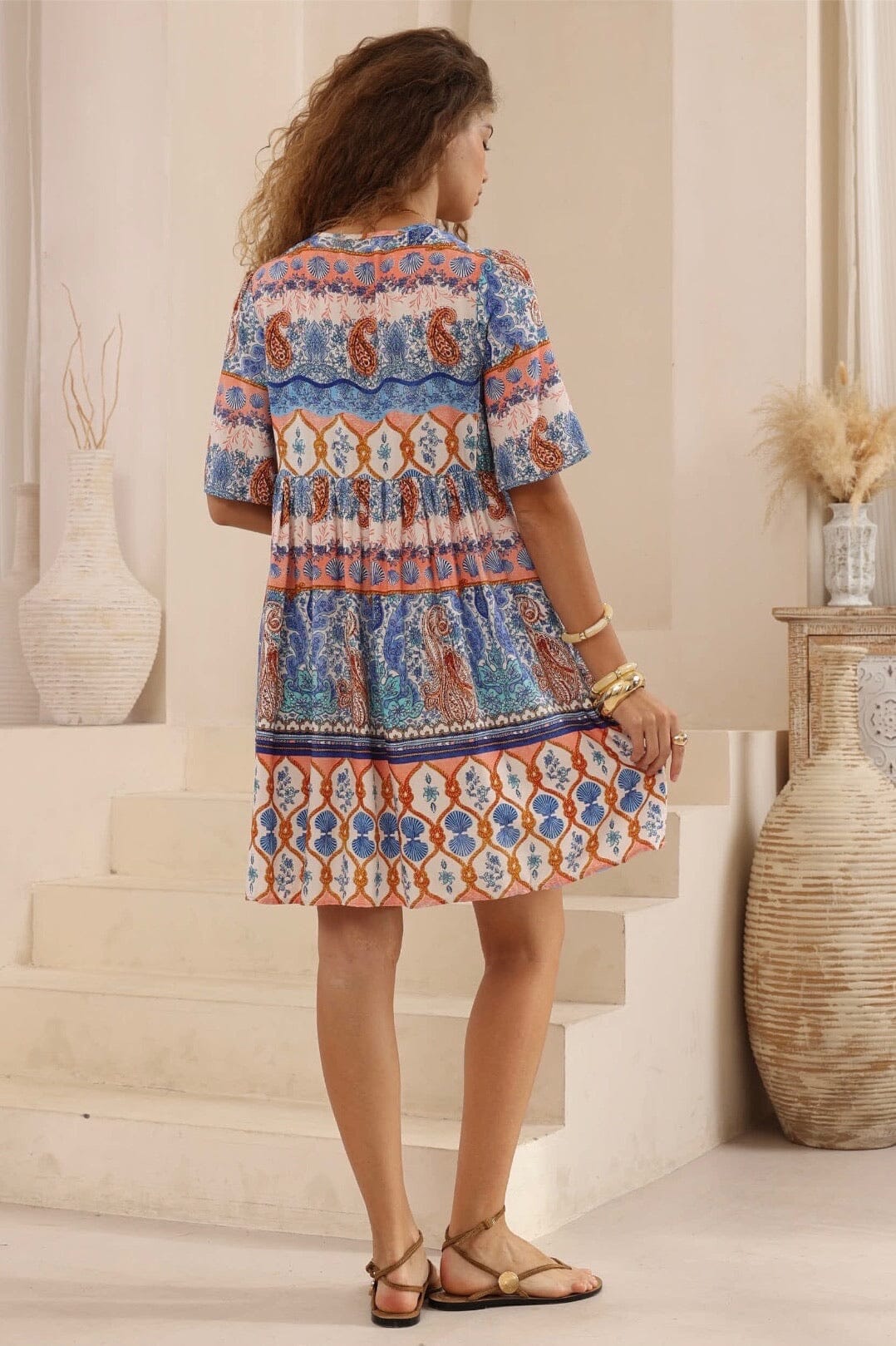 This exclusive print relaxed fit dress is a must have for your season wardrobe! With cute tassel ties, buttons at bust and easy fit, slip on over your swimsuit, pop on with sandals, this boho beauty will take you through the day in comfort and style, it even has pockets!